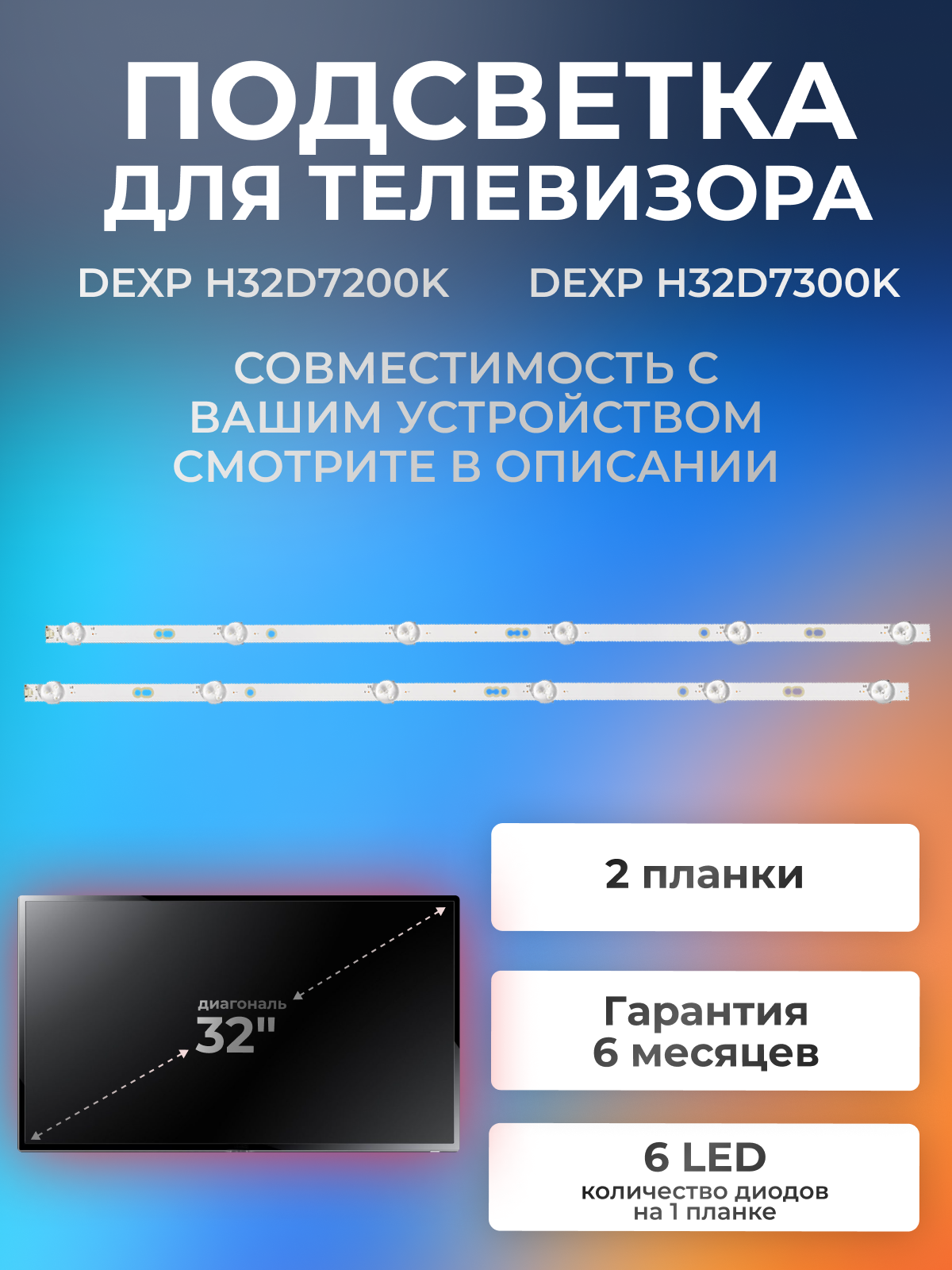 Отзывы на Подсветка для телевизоров DEXP H32D7200K, H32D7300K 32" 3V / 6 led / 3 pin (комплект 2 шт) 580mm MS-L2794 V1, HV320WHB-N56