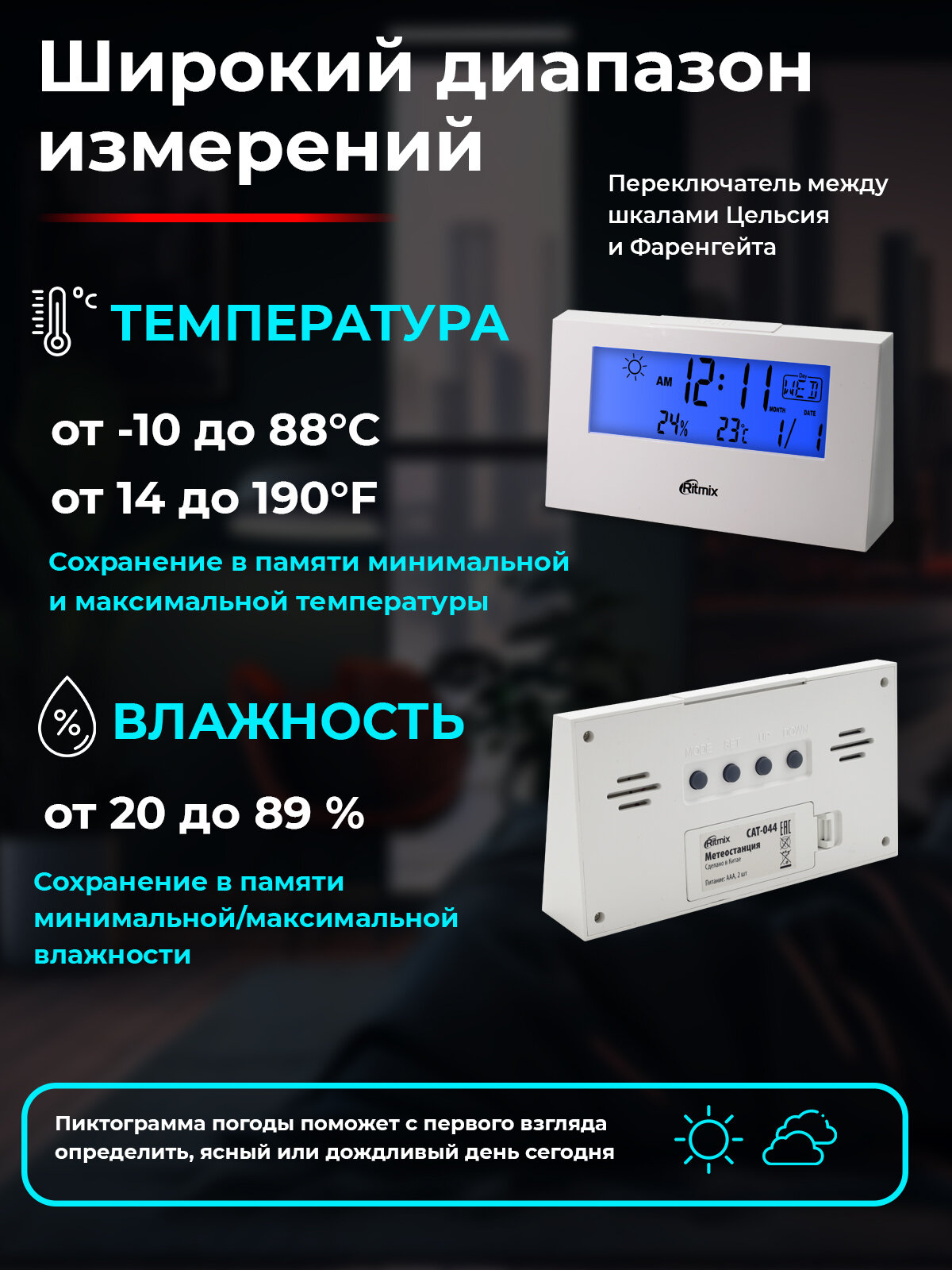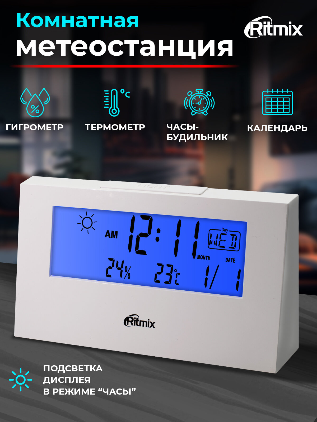 Метеостанция RITMIX CAT-030 черный/белый, дисплей LCD, термометр комнатный, гигрометр комнатный,электронные часы, будильник, календарь