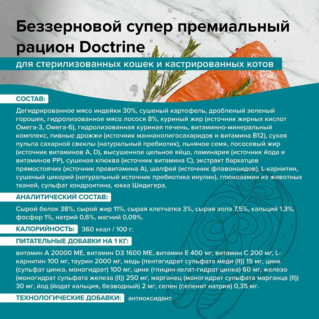 DOCTRINE Беззерновой сухой корм для стерилизованных кошек и кастрированных котов, индейка и лосось, 10кг информация:
