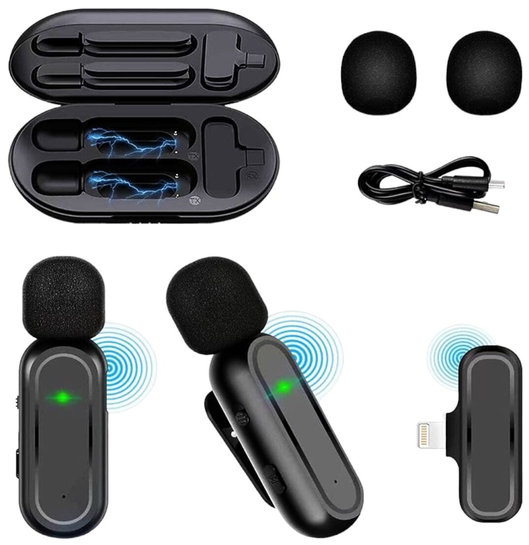 Беспроводной петличный микрофон Lightning for iPhone, iPad. Кейс для зарядки, 2 микрофона, приемник Lightning Штекер.