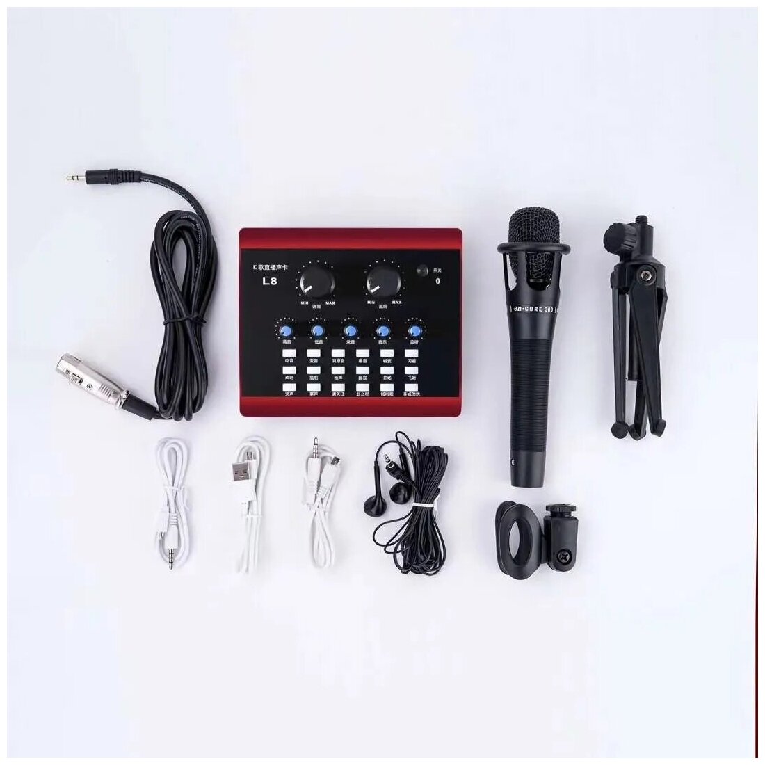 Студийный конденсаторный микрофон для записи голоса с триподом и внешней звуковой картой L8 (микшер 12 эффектов). Для блогеров и стриминга. информация: