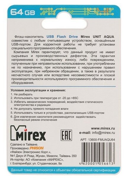 Отзывы на Флешка Mirex UNIT AQUA, 64 Гб, USB2.0, чт до 25 Мб/с, зап до 15 Мб/с, синяя(В наборе1шт.)