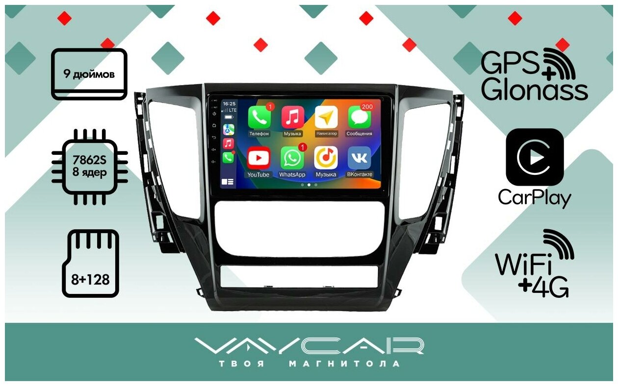Магнитола Vaycar 09VO8 для MITSUBISHI Pajero Sport 2015-2019 (Андроид, 8+128, 8 ядер, WiFi, BT, 4G, GPS, QLED 9")