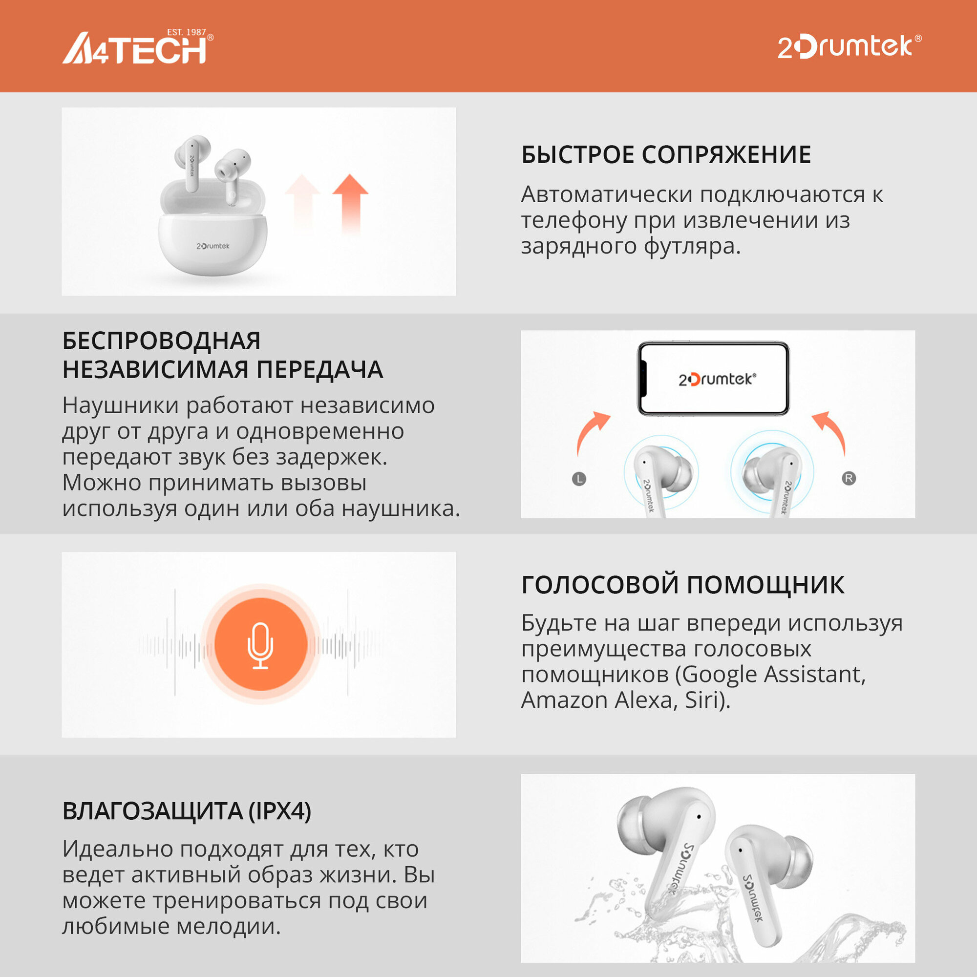 10 цен на Наушники A4TECH 2Drumtek B25 TWS, Bluetooth, вкладыши, белый [b25 grayish white]
