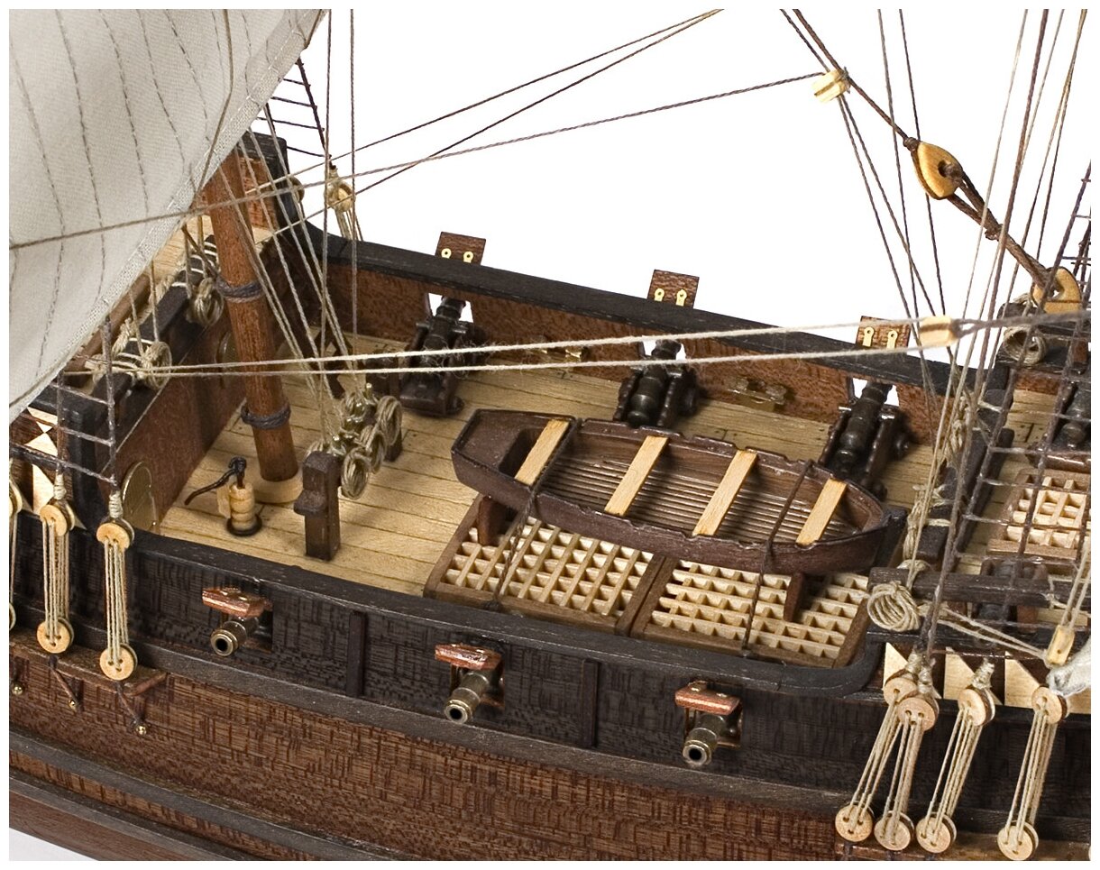 | Комплектация | корпус с двойной обшивкой и настилом палуб отдельными рейками / готовые фальшборта с прорезанными лазерной резкой пушечными портами / деревянные решетки / восемь литых пушек на металлических лафетах и четыре фальш-пушки / кормовой фонарь / якоря / нагеля / эзельгофты / шлюпка из металла / латунные петли для руля / рымы / цепочка / фототравленные двери / утки / сборные трапы / кормовой декор и петли пушечных портов / круглые заготовки светлого дерева для рангоута / светлые и темные нити разных диаметров для такелажа / блоки и юферсы из светлого дерева / готовые паруса / иллюстрированная инструкция |