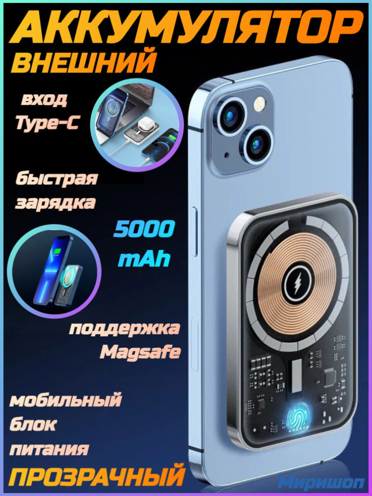 10 цен на Прозрачный внешний аккумулятор с поддержкой Magsafe на 5000mAh и быстрая зарядка VdenmenV DP21