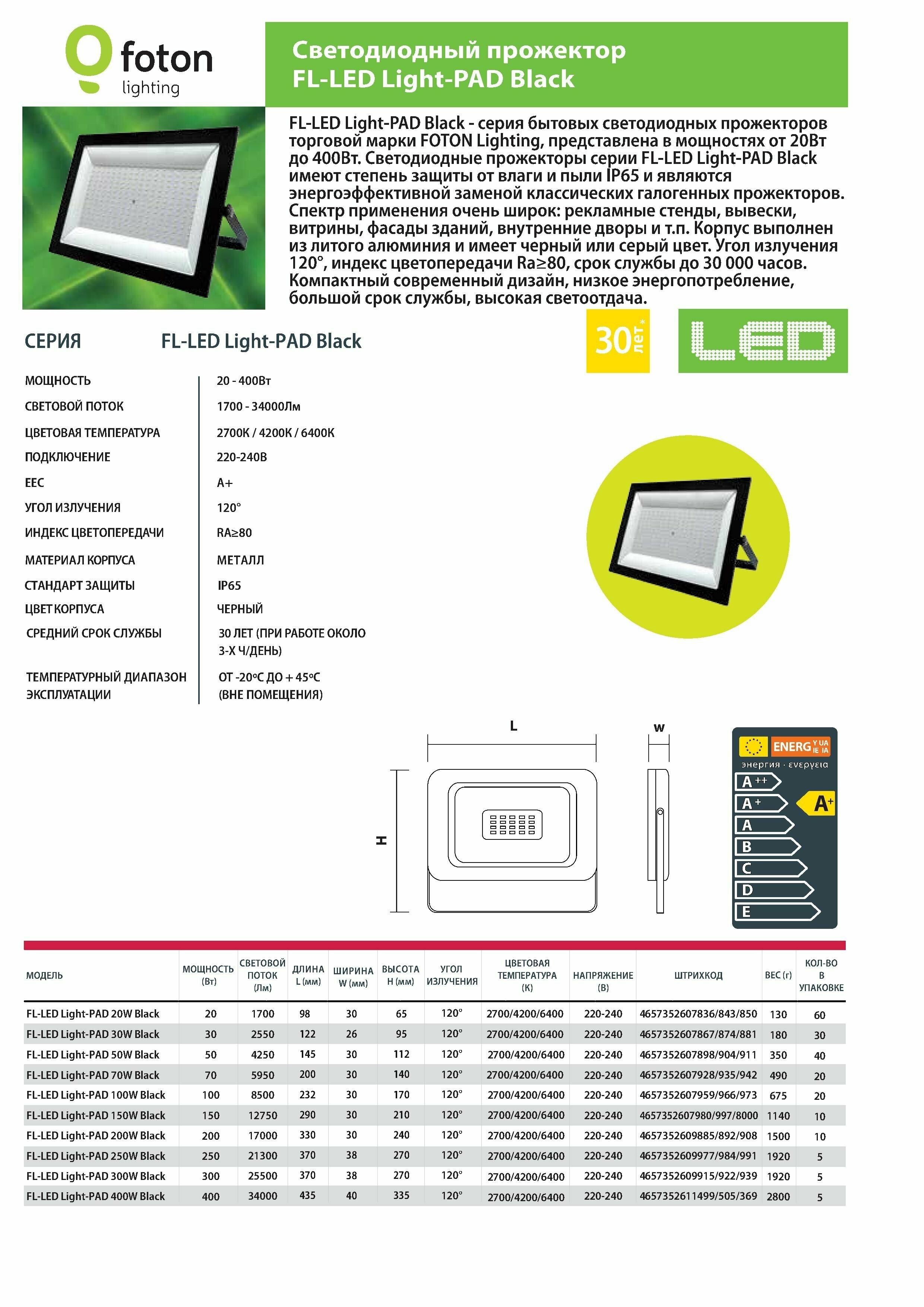 Светодиодный прожектор FL-LED Light-PAD Black 30W 4200K информация: