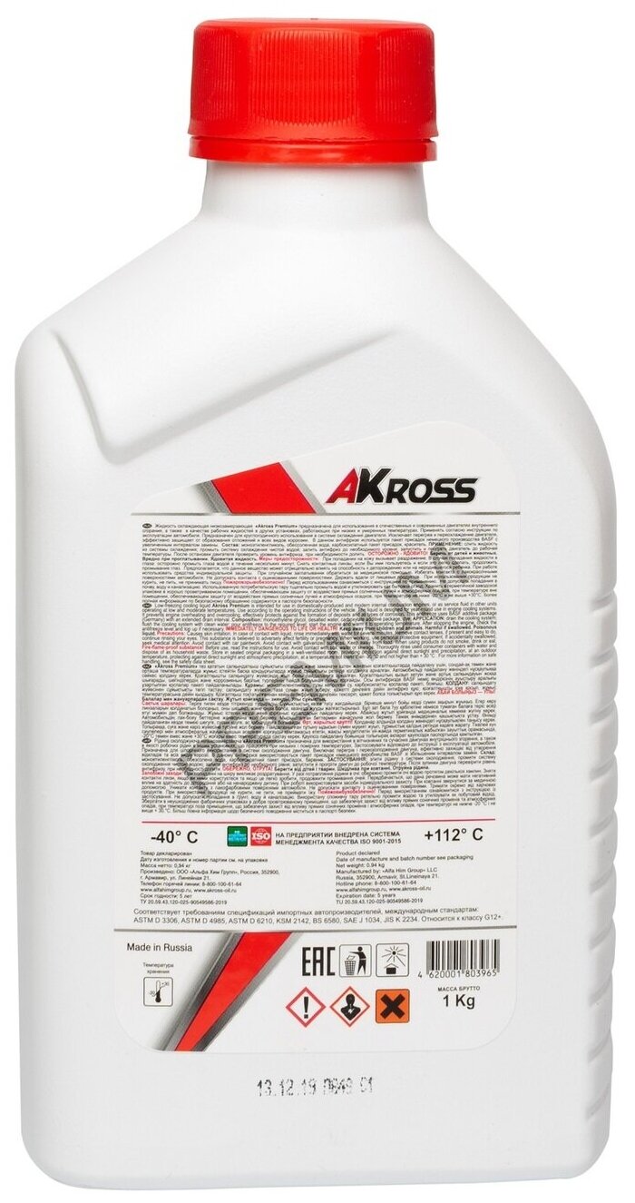 AKROSS AKS0001G12 Антифриз "Akross" Premium G12+ (1 кг) красный информация: