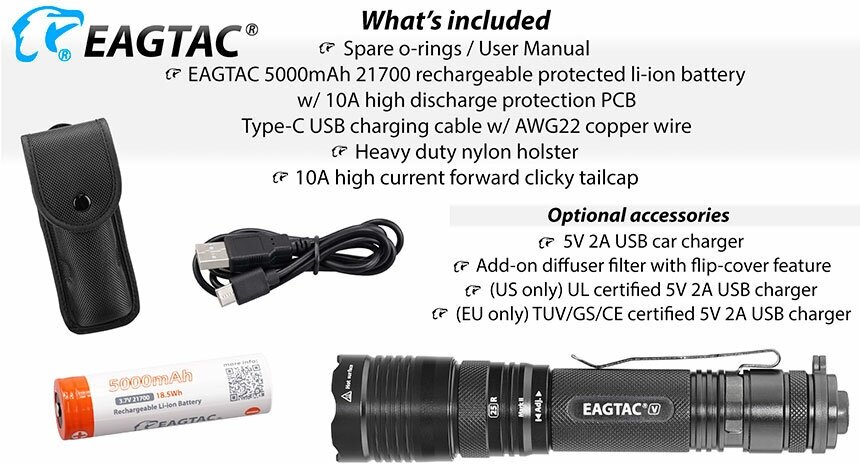 | Подробная комплектация | фонарь, аккумулятор EagleTac 21700 (5000 мАч, разрядный ток 10 А), кабель с разъёмами USB тип C / USB тип A, темляк, запасные уплотнительные кольца, жёсткий чехол, инструкция |