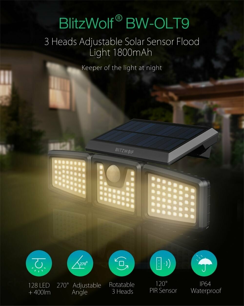 Отзывы на Светильник уличный BlitzWolf BW-OLT9 Rotatable 3 Heads Adjustable Waterproof PIR Sensor Solar Flood Light 3000K, черный