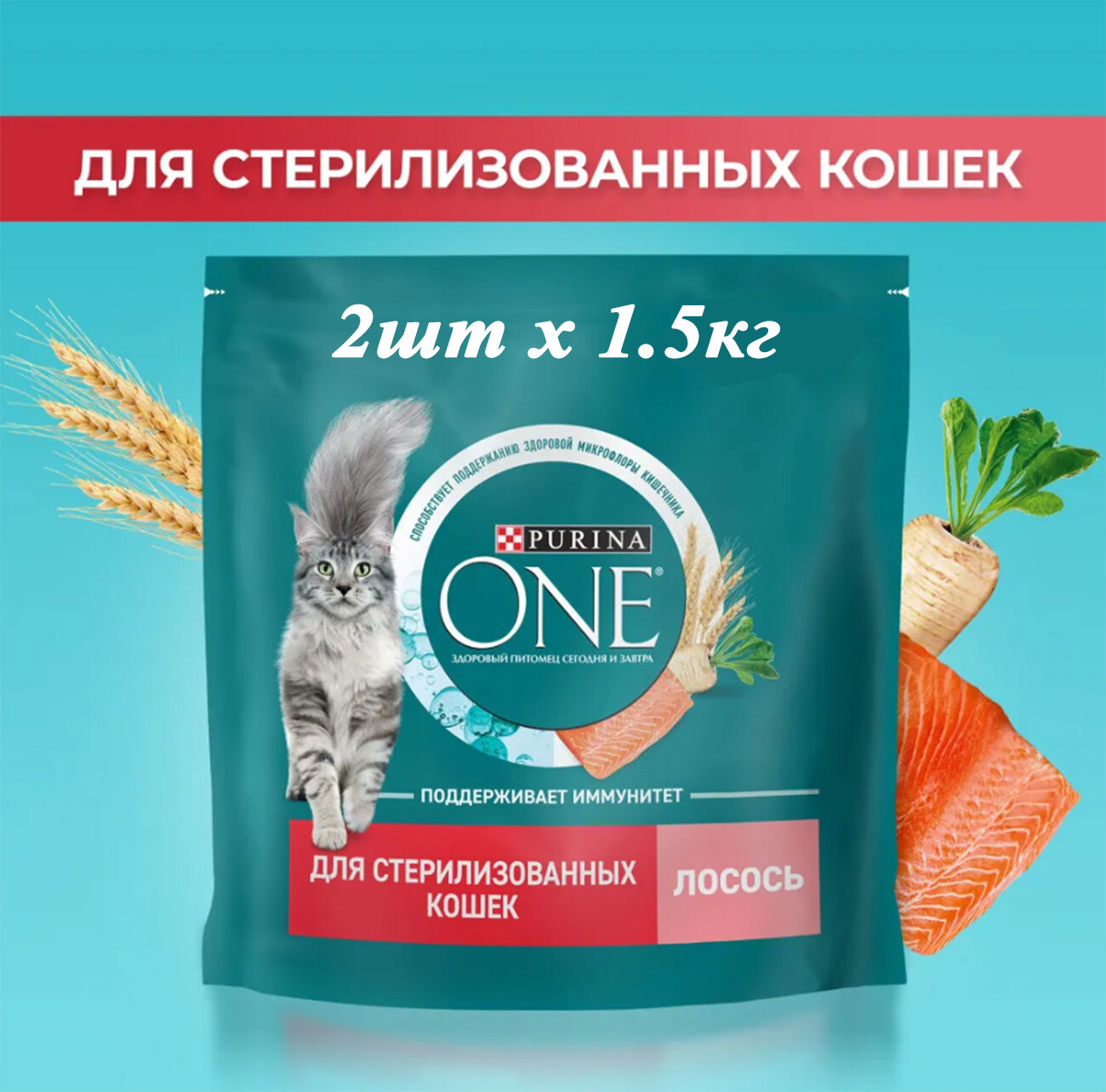 Набор PURINA ONE 2 шт х 1,5 кг Сухой корм для стерилизованных кошек и кастрированных котов, с высоким содержанием лосося и пшеницей 1,5 кг