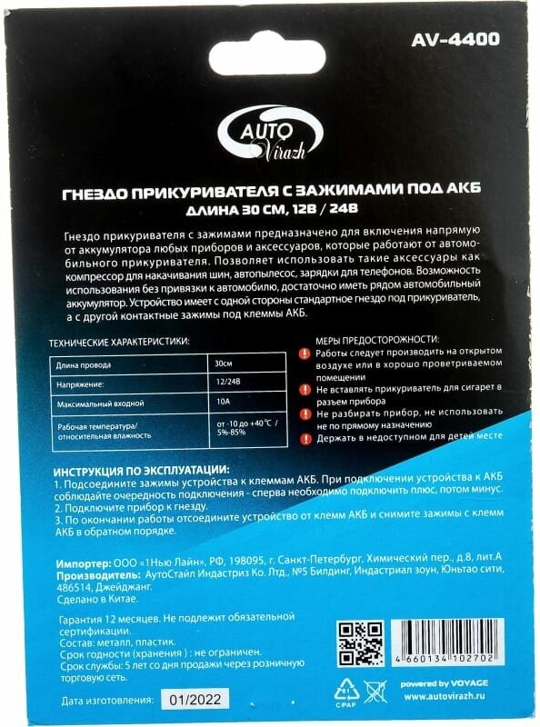 AUTOVIRAZH Гнездо прикуривателя с крокодилами AV-4400 информация: