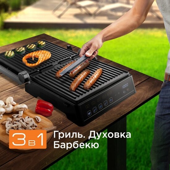 | Особенности | антипригарное покрытие / контактный гриль / поддон для сбора жира / регулировка высоты верхней панели / съемные пластины |