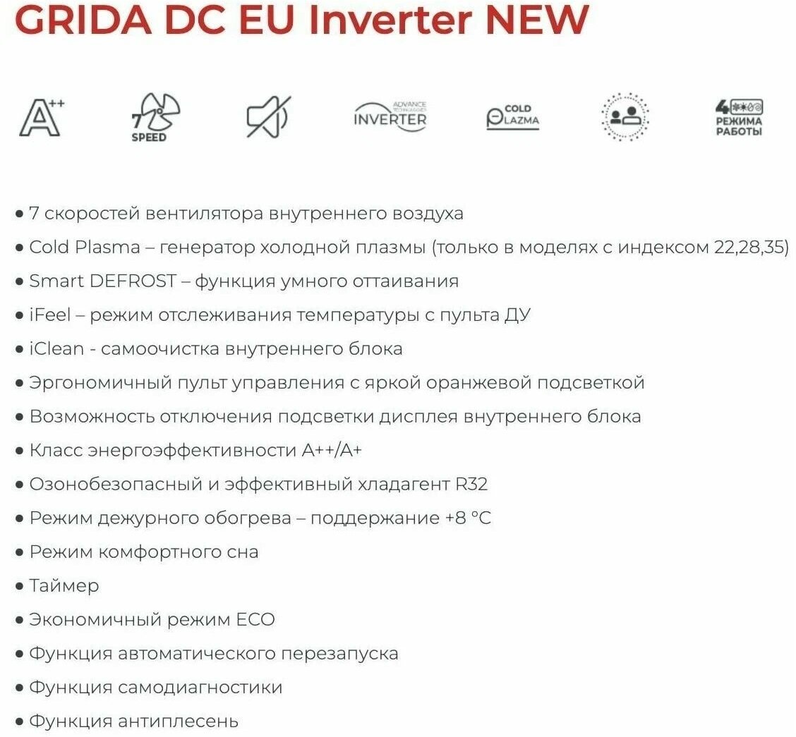 | Дополнительные функции | автоматическое поддержание температуры / автоперезапуск / ионизация / разморозка внешнего блока / самодиагностика / система против образования льда / теплый пуск |