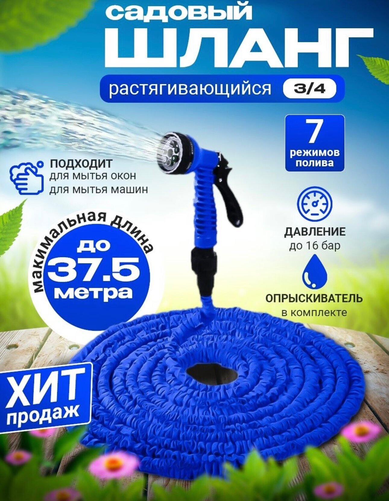 Шланг садовый складной растягивающийся для полива Magic Hose 37.5 м / Растягивающийся удобный шланг для дома и дачи информация:
