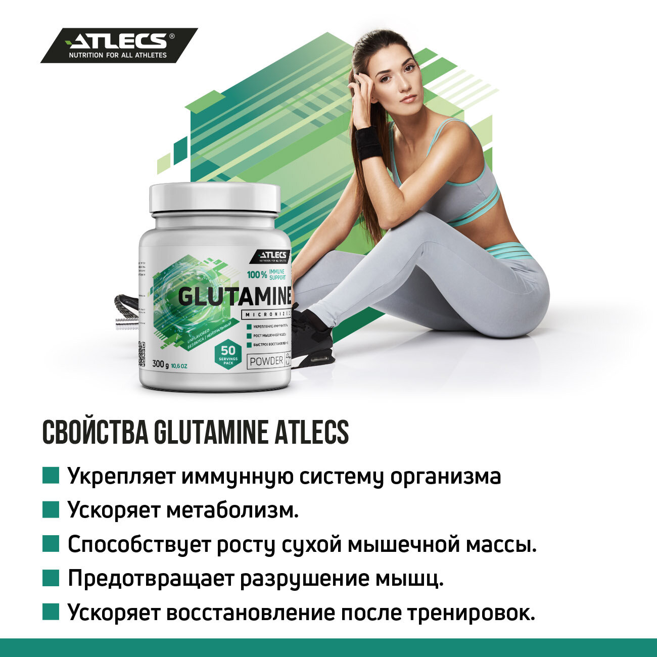 Аминокислоты Atlecs L-Glutamine нейтральный, 300 гр. (50 порций) информация: