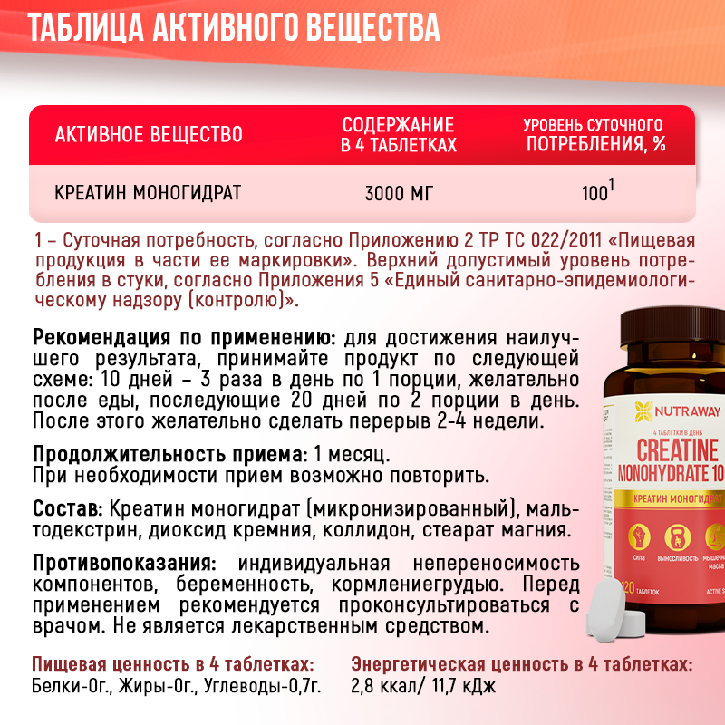 Креатин Моногидрат 100% / Creatine Monohydrate 100% Nutraway 120 таблеток информация: