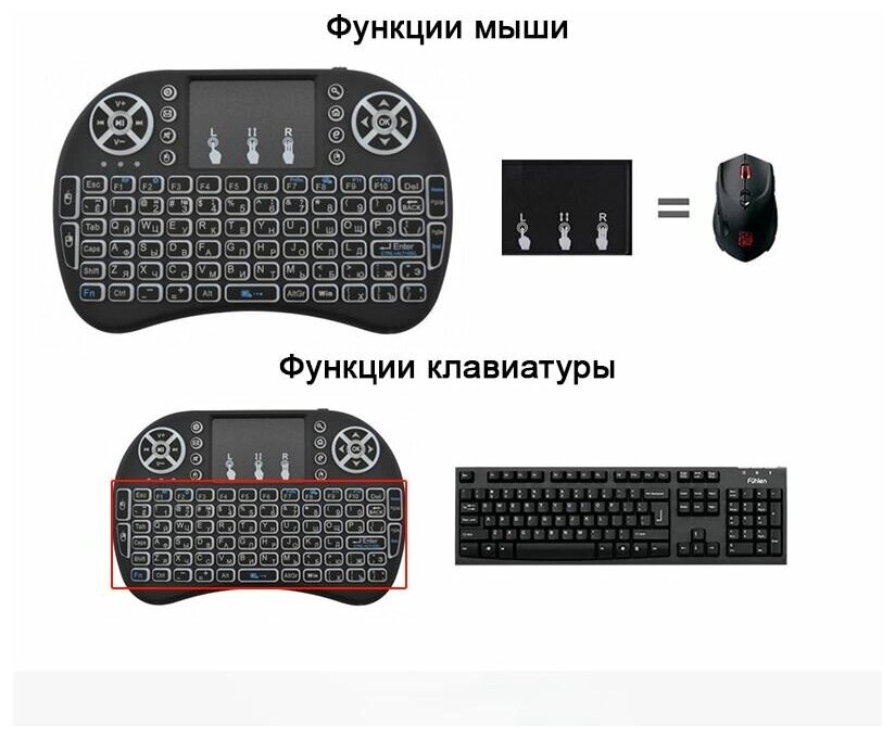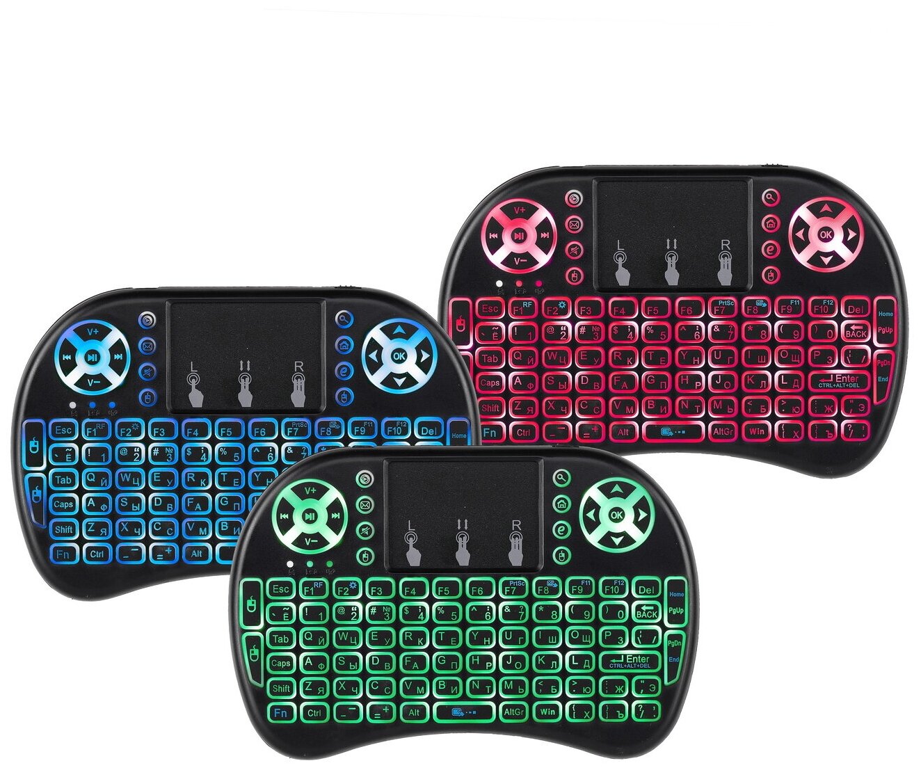 10 цен на Беспроводная клавиатура GoldMaster i8 черный, русская и английская раскладки, с RGB подсветкой, аккумулятором и RUS инструкцией.