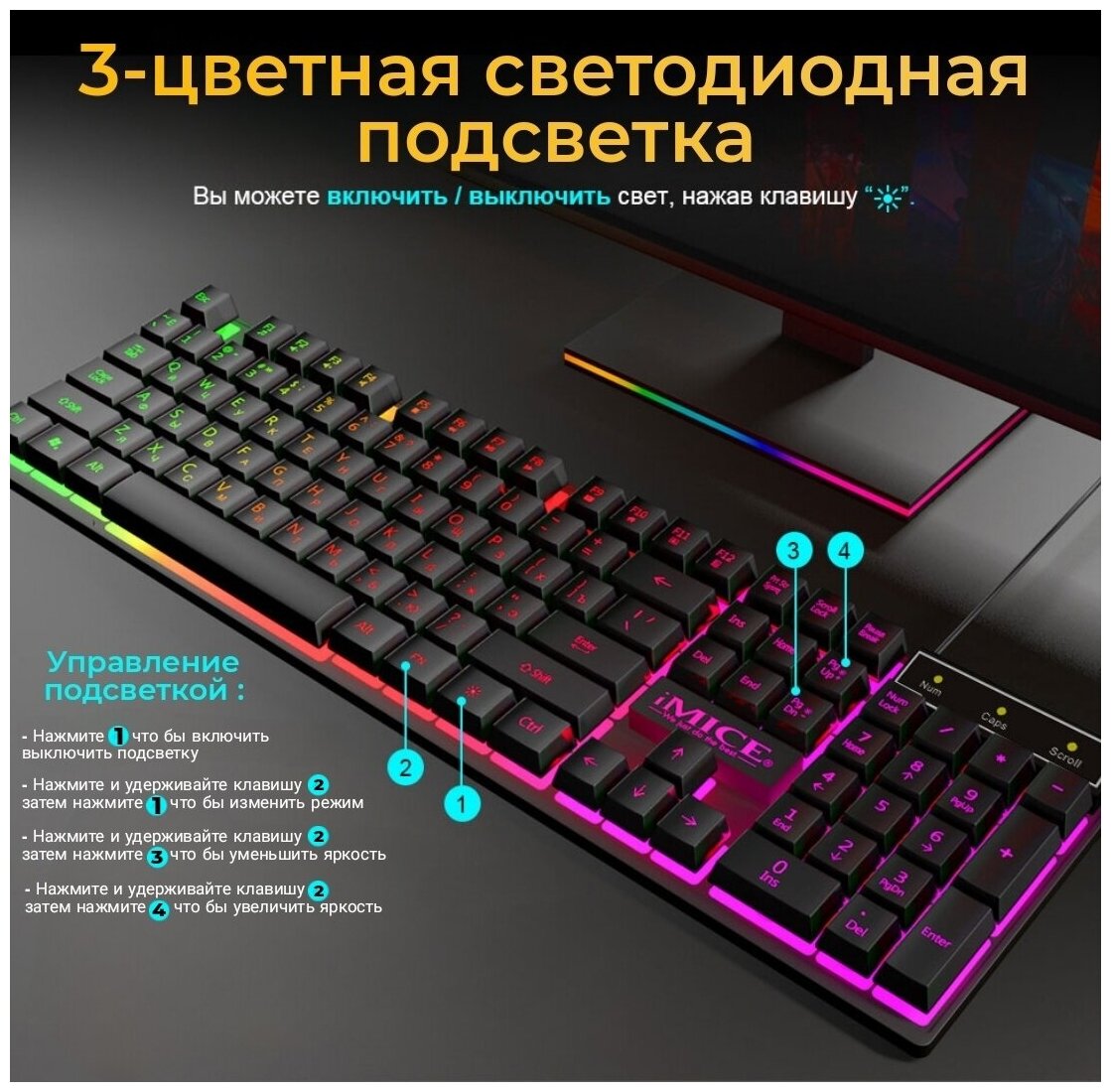 Клавиатура "IMICE" мембранная, игровая, 2 режима подсветки, Водо-защита, 104 клавиши, USB проводная черный RU/EN информация: