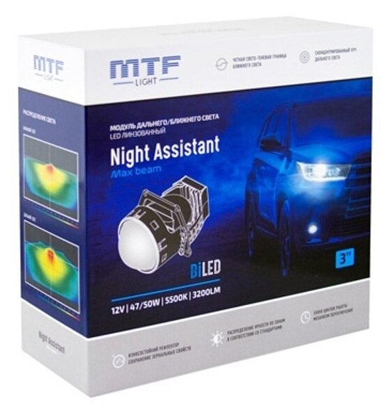 Светодиодные модули ближнего/дальнего света MTF Light NIGHT ASSISTANT MaxBeam, линзованные, бескорпусные, 12В, 47/50Вт, 5500К, 3 дюйма, комплект 2шт. информация: