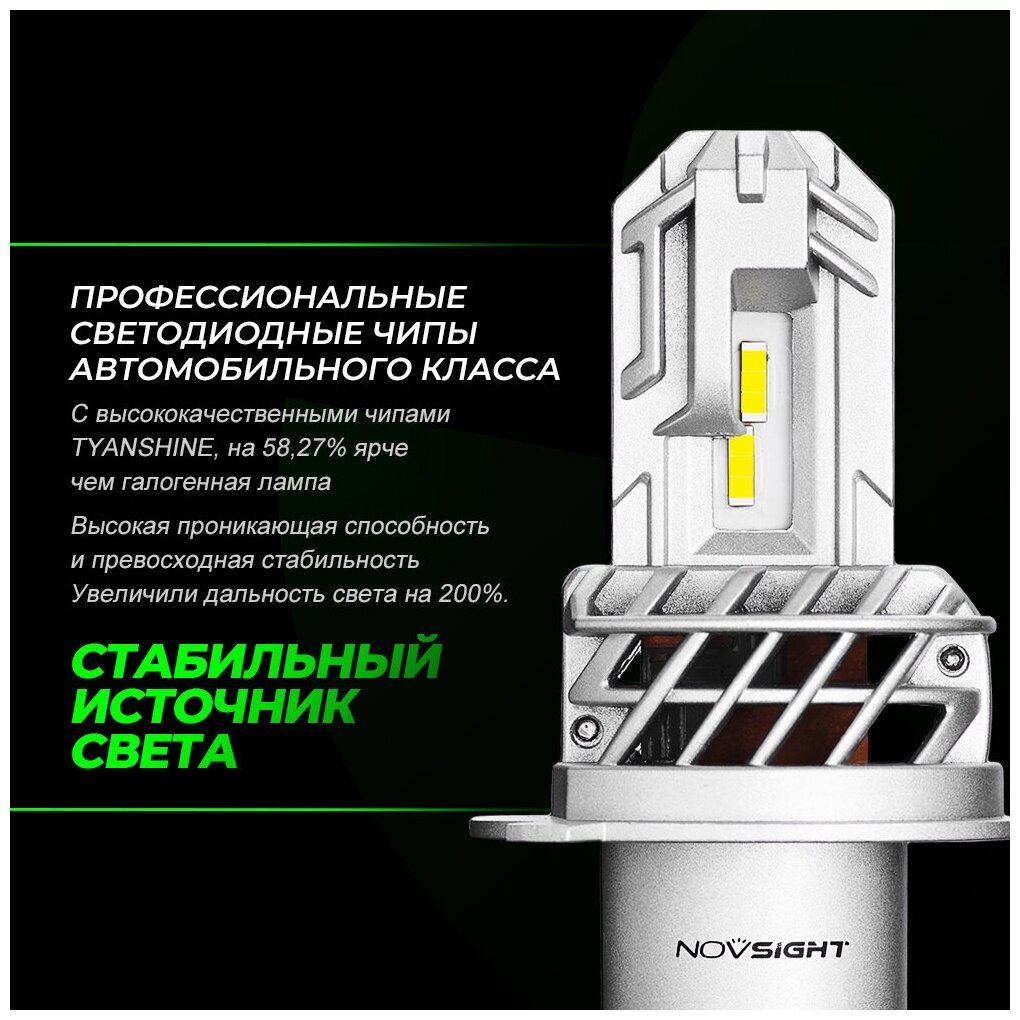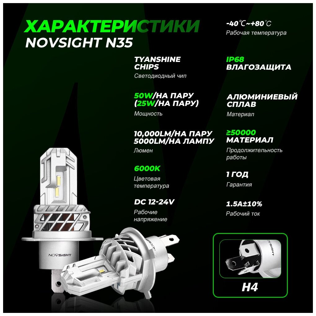 Светодиодная автомобильная LED лампа Novsight модель N35, цоколь H4 - 50Вт (2 шт) 6000К белый свет информация: