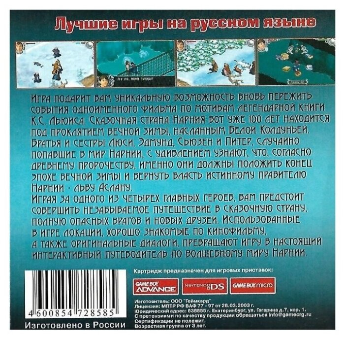 Характиристики этого товара не найдены!Отзывы на Chronicles of Narnia: Lion, Witch and Wardrobe (Хроники Нарнии) [GBA, рус.версия] (Platinum) (128M)