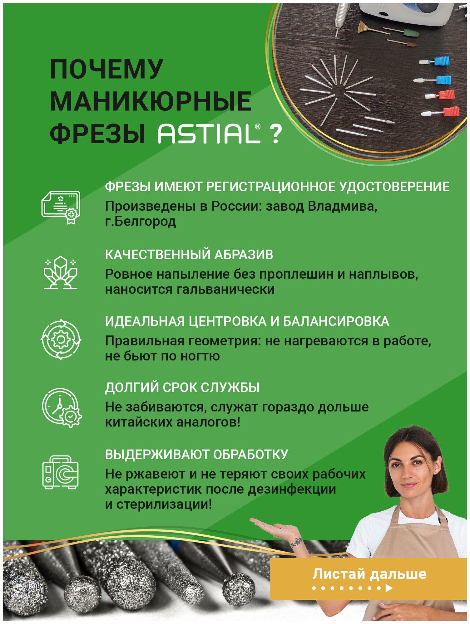 Astial / Фреза для маникюра и педикюра алмазная грубая зеленая Пламя с острым кончиком Набор для кутикулы 5 шт информация: