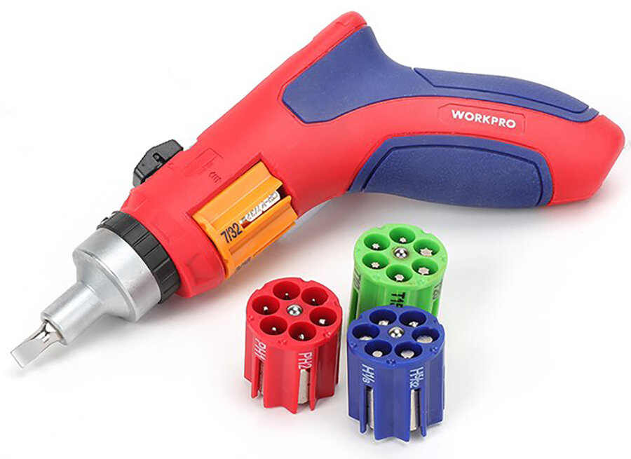Отзывы на Реверсивная пистолетная отвертка WORKPRO с храповым механизмом и автоматической сменой бит 24 насадки WP221048