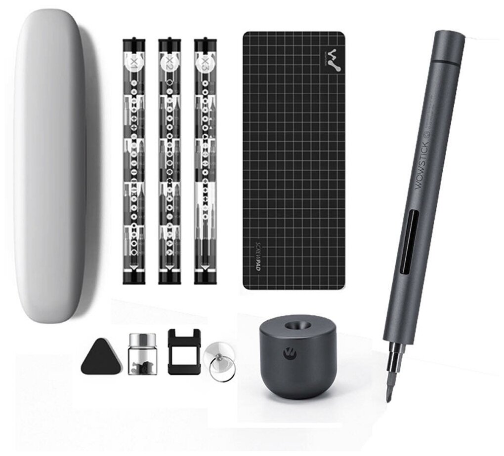 | Комплектация | microUSB-кабель для зарядки, магнитный коврик, набор бит (56 шт.), подставка, баночка с винтами, пластиковый медиатор, присоска, магнетизатор, бокс для переноски |