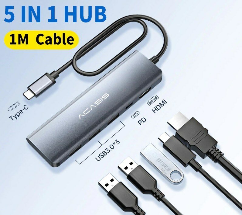 Док-станция 5-в-1 USB Type-C -> 3xUSB 3.0+HDMI 4K+PD 100W ACASIS HBC-028 (кабель 1.0м) информация: