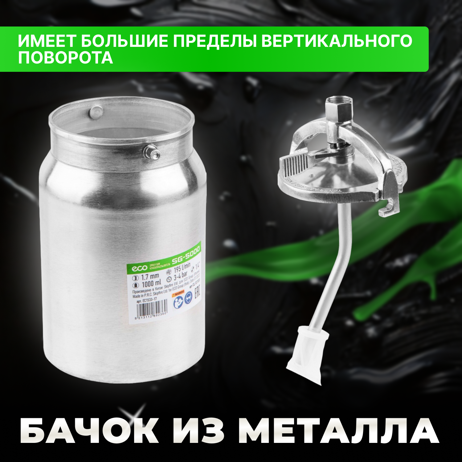10 цен на Краскораспылитель ECO SG-5000 (сопло ф 1.7 мм) (HVLP, сопло ф 1.7 мм, нижн. бак 1000 мл) (EC1533-17)