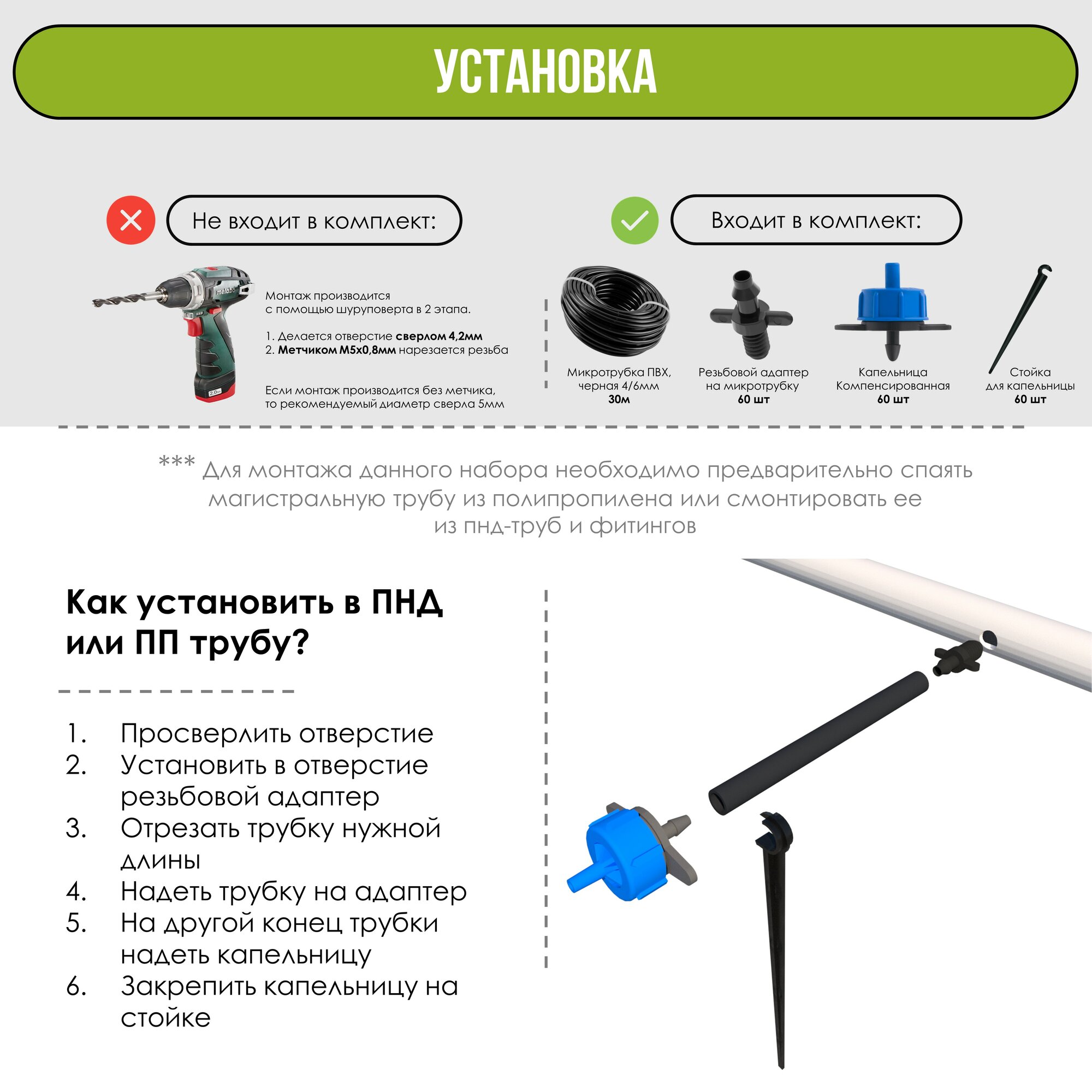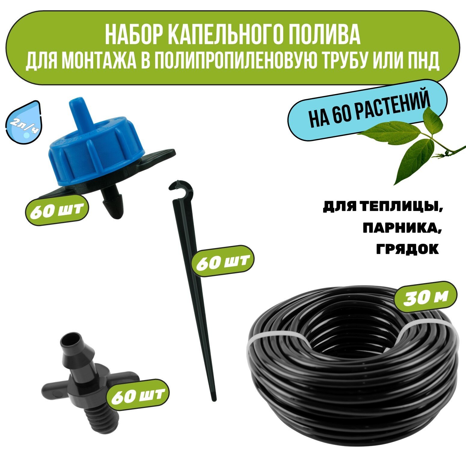 Набор капельного полива на 60 растений. Для монтажа в полипропиленовую или ПНД трубу. Для теплицы, грядок, сада, питомников. информация: