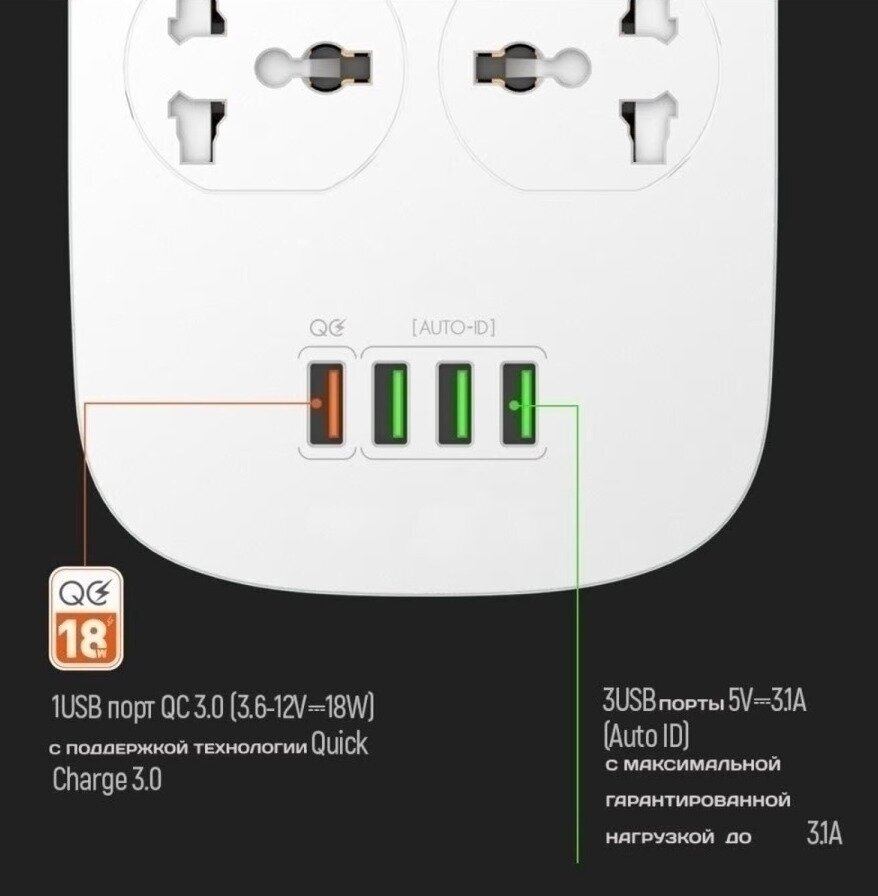 Многофункциональный сетевой фильтр LP4407Q 4 розетки + 4USB порта QC3.0, 2000mm информация: