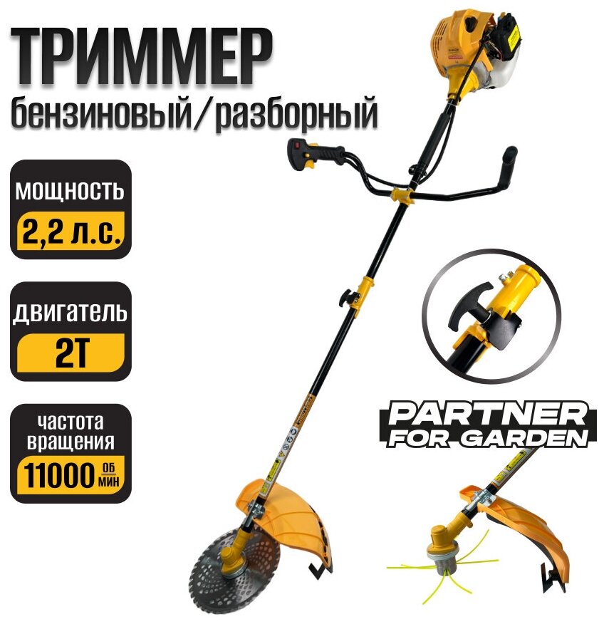 10 цен на Бензокоса / Бензотриммер для травы и кустов Partner for Garden GT 40 ( 2,2 л.с, 2-х тактный двигатель, разборный ВАЛ, леска И НОЖ )
