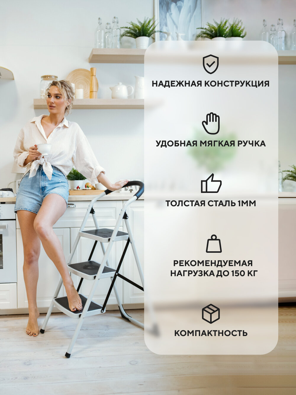 Отзывы на Стремянка 3-х ступенчатая усиленная. С широкими антискользящими ступенями. Макс нагрузка 150 кг.