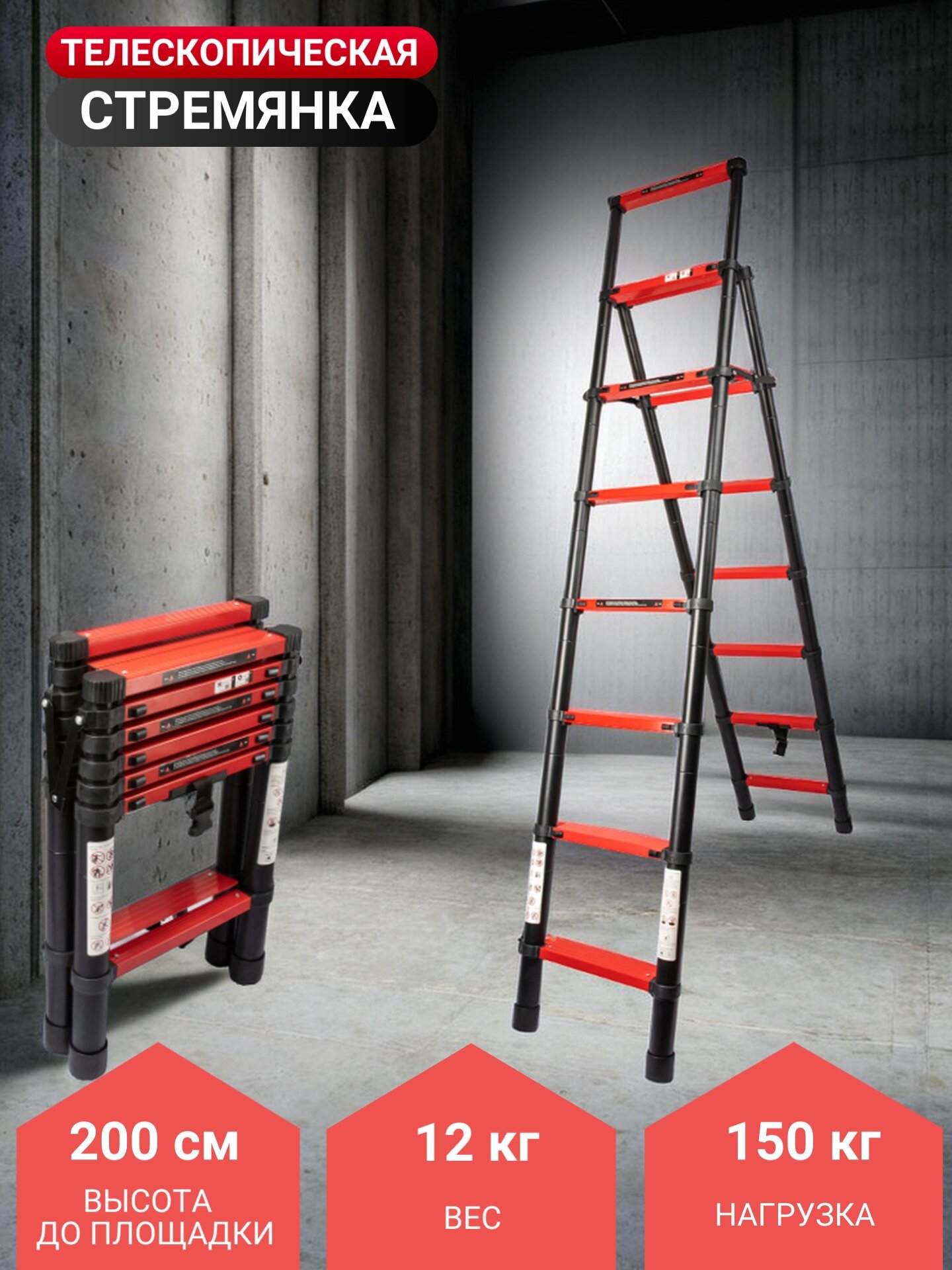 Стремянка лестница телескопическая алюминиевая, 7+8 ступеней информация: