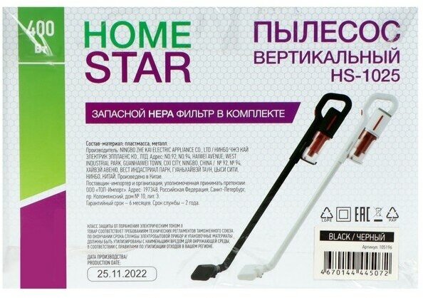 Пылесос вертикальный HomeStar HS-1025 черный, проводной информация: