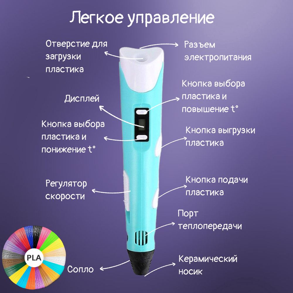 3D ручка второго поколения 3D Pen-2 для детей / С дисплеем и набором пластика PLA (3 цвета, 9 метров), голубой