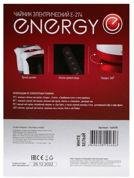 Чайник электрический Energy E-274 164078 1.7 л белый информация: