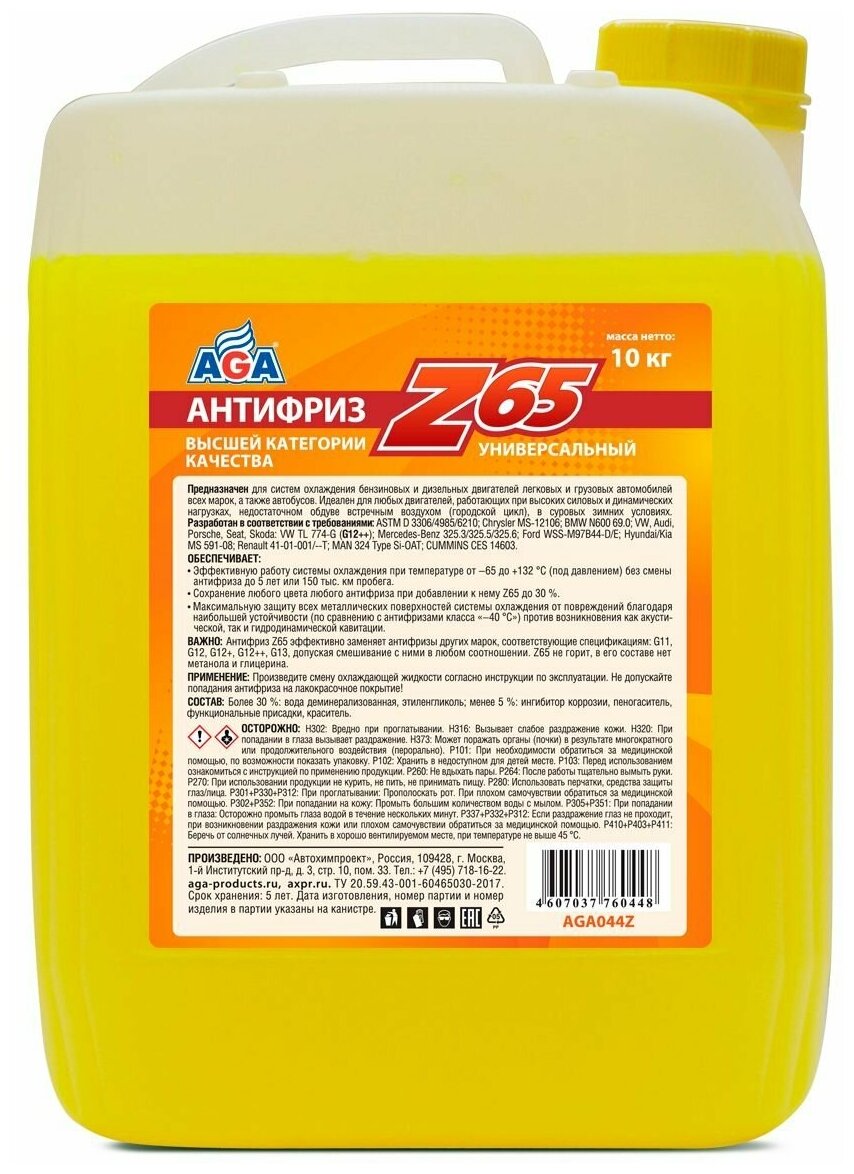 AGA AGA044Z Жидкость охлаждающая "Антифриз" AGA Z-65 желтый (-65) 10 л G12 2 579 ₽