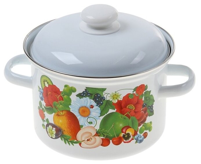 Кастрюля эмалированная 1,5 л с ободком белая с рисунком Фруктовая фантазия