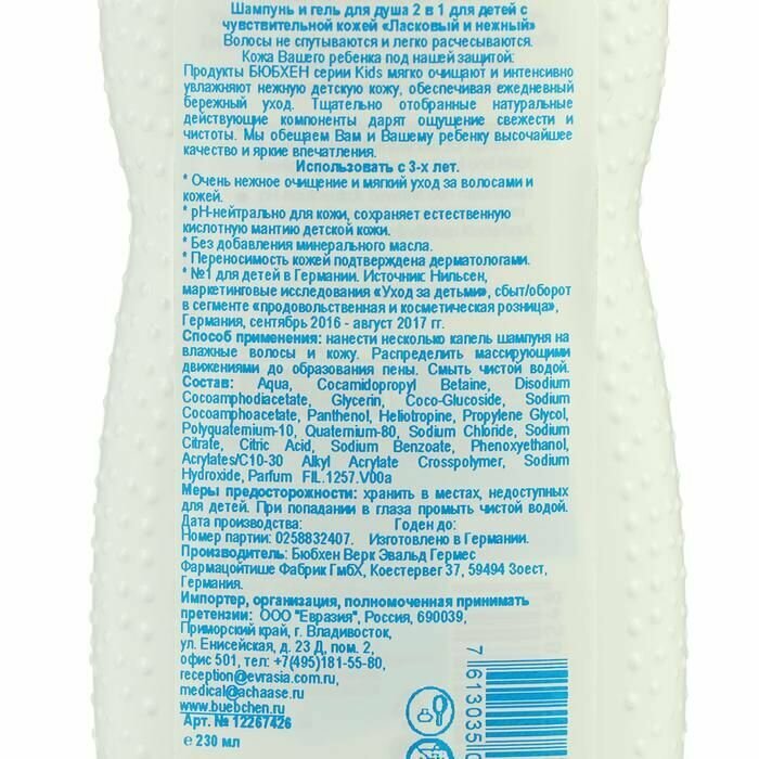 Шампунь для мытья волос и тела Bubchen "Ласковый и нежный" для детей с чувствительной кожей, Bubchen . информация: