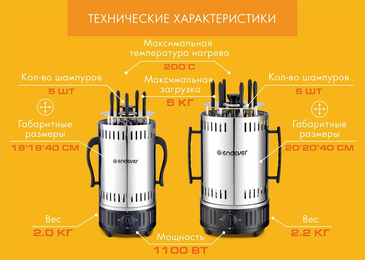 Электрошашлычница Endever Grillmaster-290/295 / 1100 Вт / до 5 кг мяса / 6 шампуров / вращение на 180 градусов