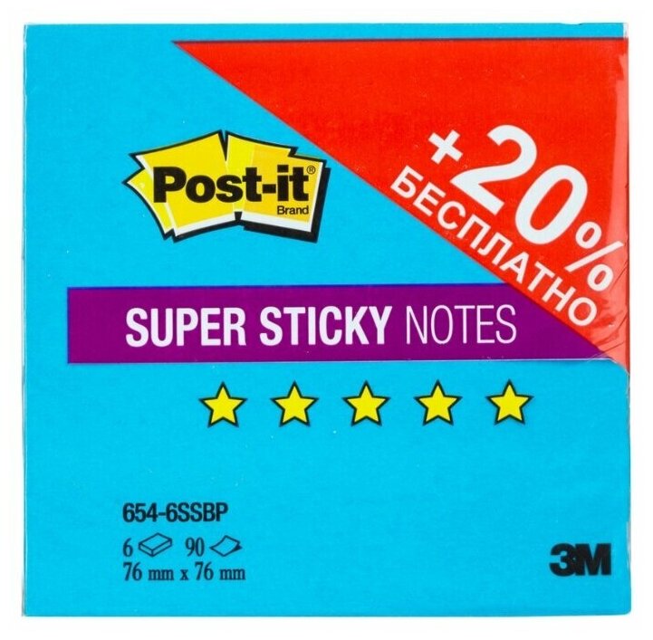 Блок самоклеящийся бумажный 3M Post-it Super Sticky 654-6SSBP Воздух Плюс 7100091464 76x76мм 90лист.