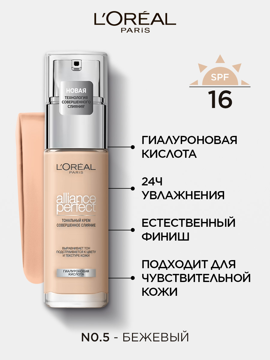 10 цен на L'Oreal Paris, Тональный крем ALLIANCE PERFECT совершенное слияние обогащенный гиалуроновой кислотой, тон 0.5N, SPF 16, 30 мл