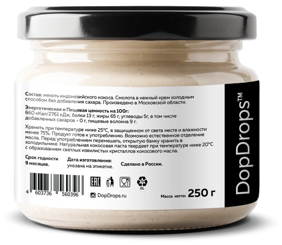 Паста Кокосовая (Урбеч из мякоти кокоса) DopDrops без добавок, 250 г информация: