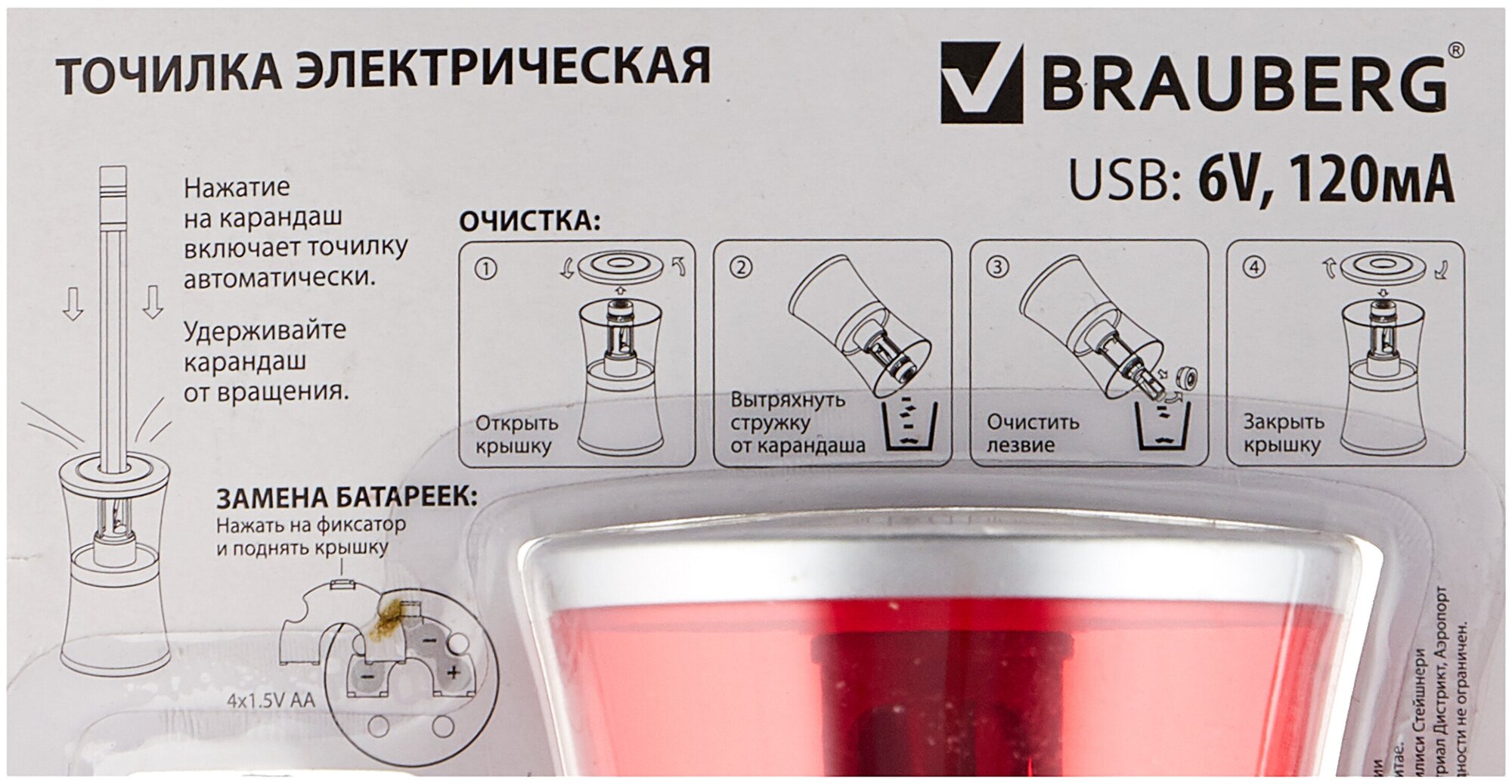 Точилка электрическая Brauberg Office style, питание от USB/4 батареек АА, красная