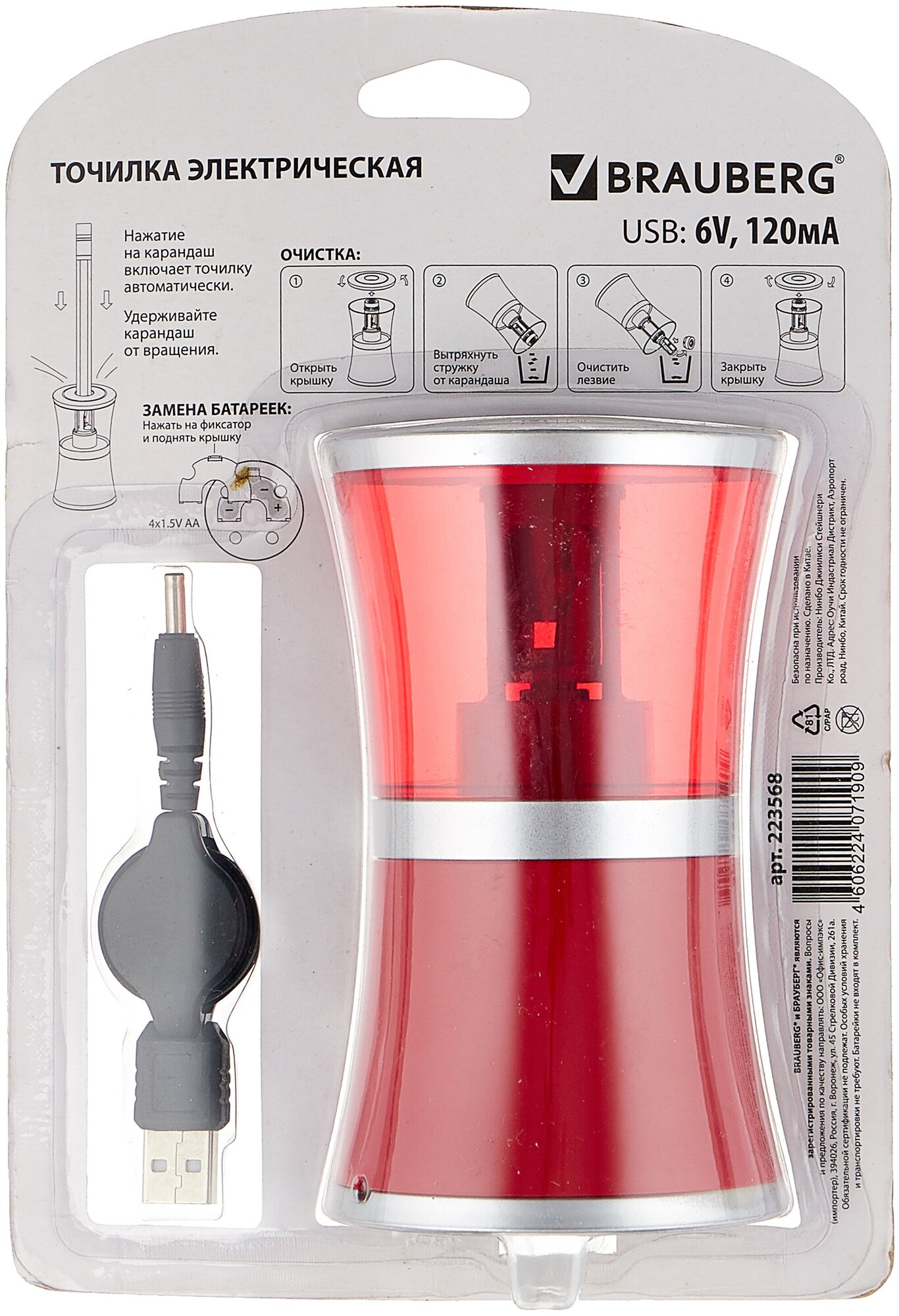 Точилка электрическая BRAUBERG "STYLE", питание от USB/4 батареек АА, красная, 223568