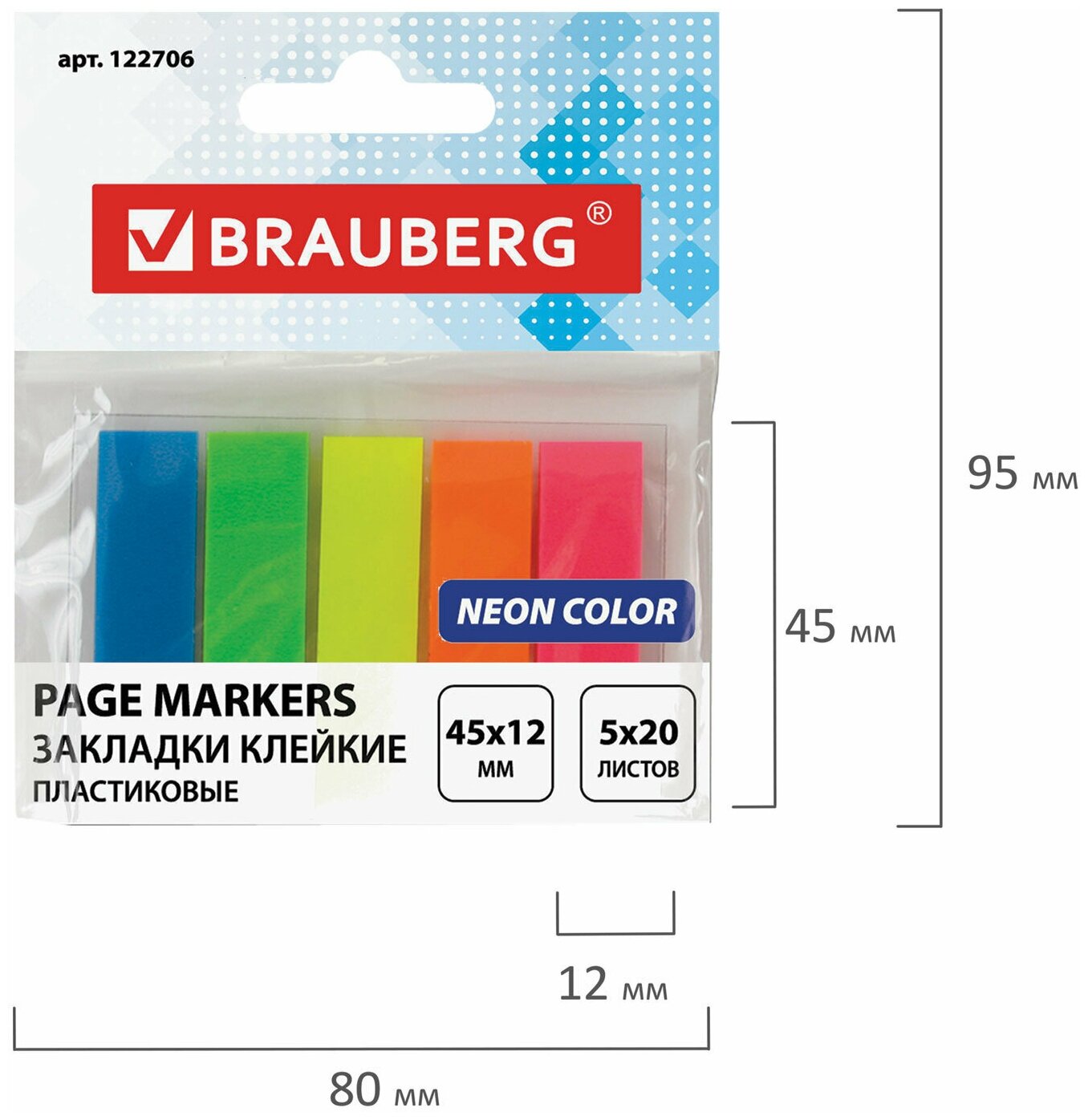 Закладки клейкие BRAUBERG неоновые, пластиковые, 45х12 мм, 5 цветов х 20 листов, на пластиковом основании, 122706