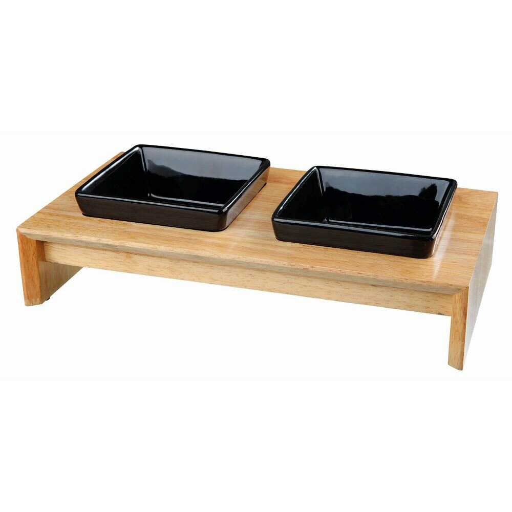 Миски керамические в деревянной подставке, 2 x 0.4 л, 36 x 19 x 7 см, миски-черные, Trixie (товары для животных, 24821)